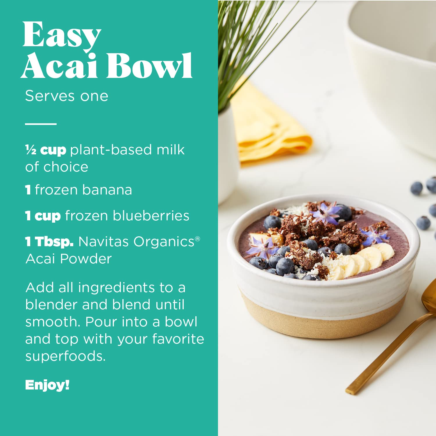 - Navitas Organics Acai Powder blends perfectly into your smoothies, oatmeal, baking and dessert recipes.