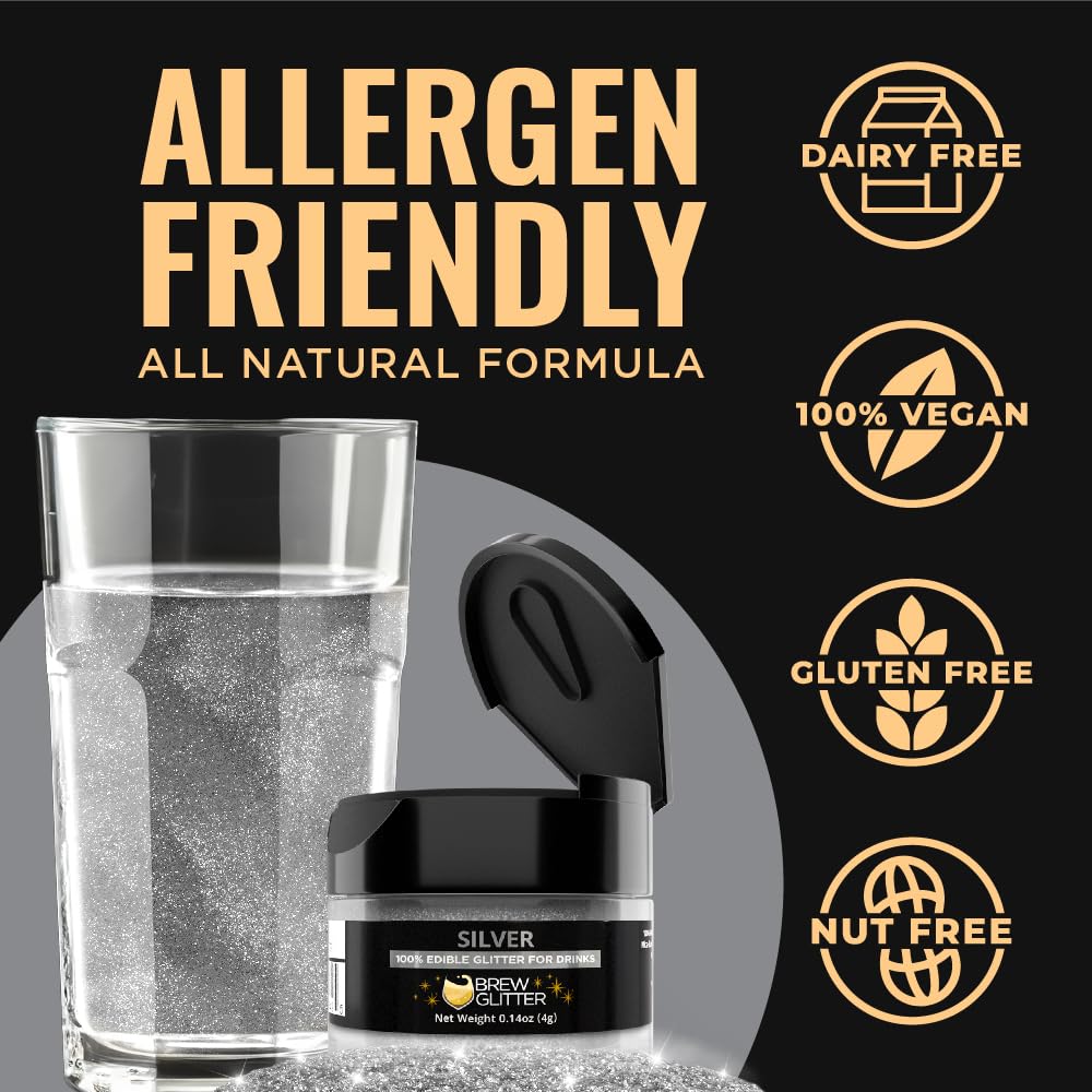 - 🌿 Brew Glitter silver drink glitter is made in the USA at SQF III, GMP, Halal, and Kosher certified facilities, and is nut-free, gluten-free, and vegan.
