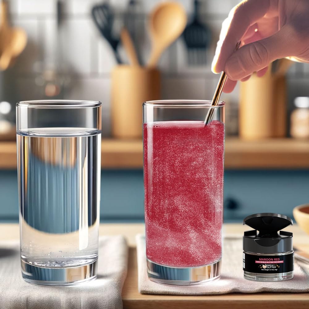 - 💫 A swirl of maroon edible drink glitter infuses glitter and color into any beverage. Open the flip top, pour in Brew Glitter, stir, and watch it shine!