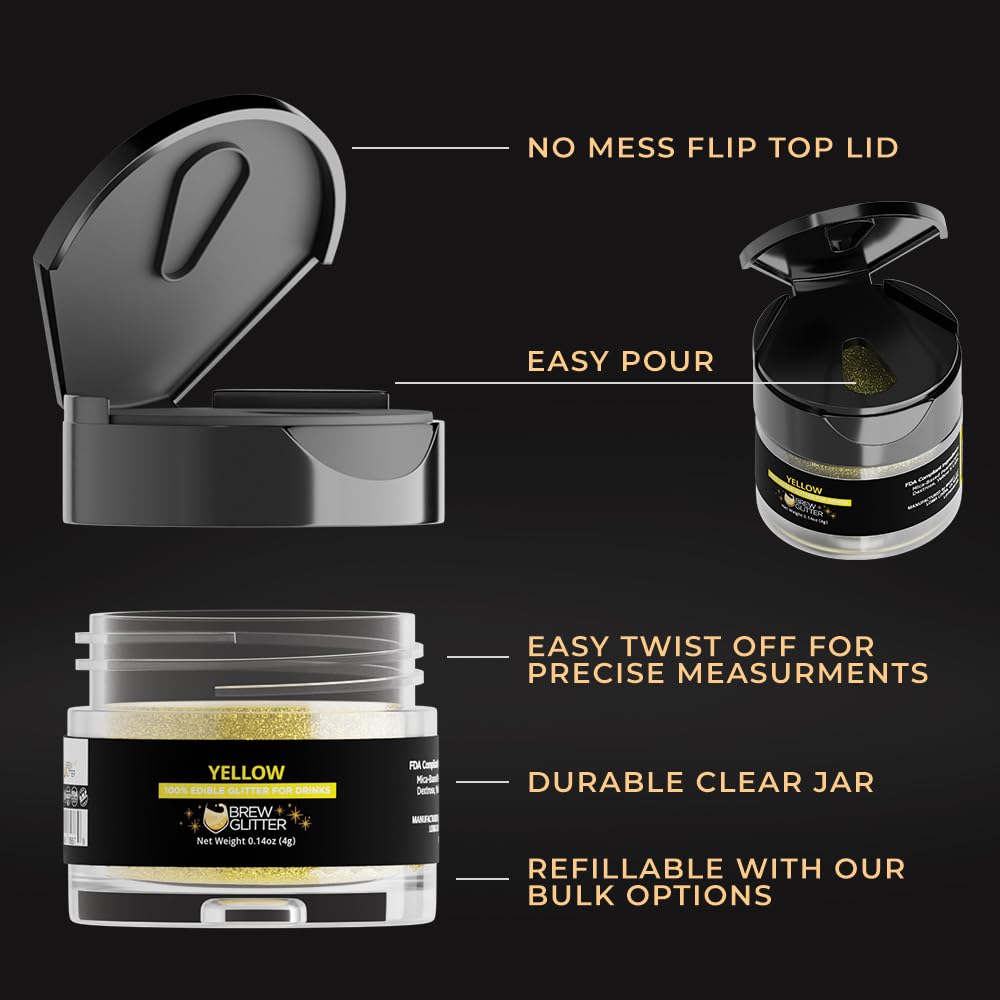 - ⭐ Brew Glitter is the #1 drink glitter manufacturer in the USA with the largest selection of yellow and other colors, boasting over 10 million satisfied customers.