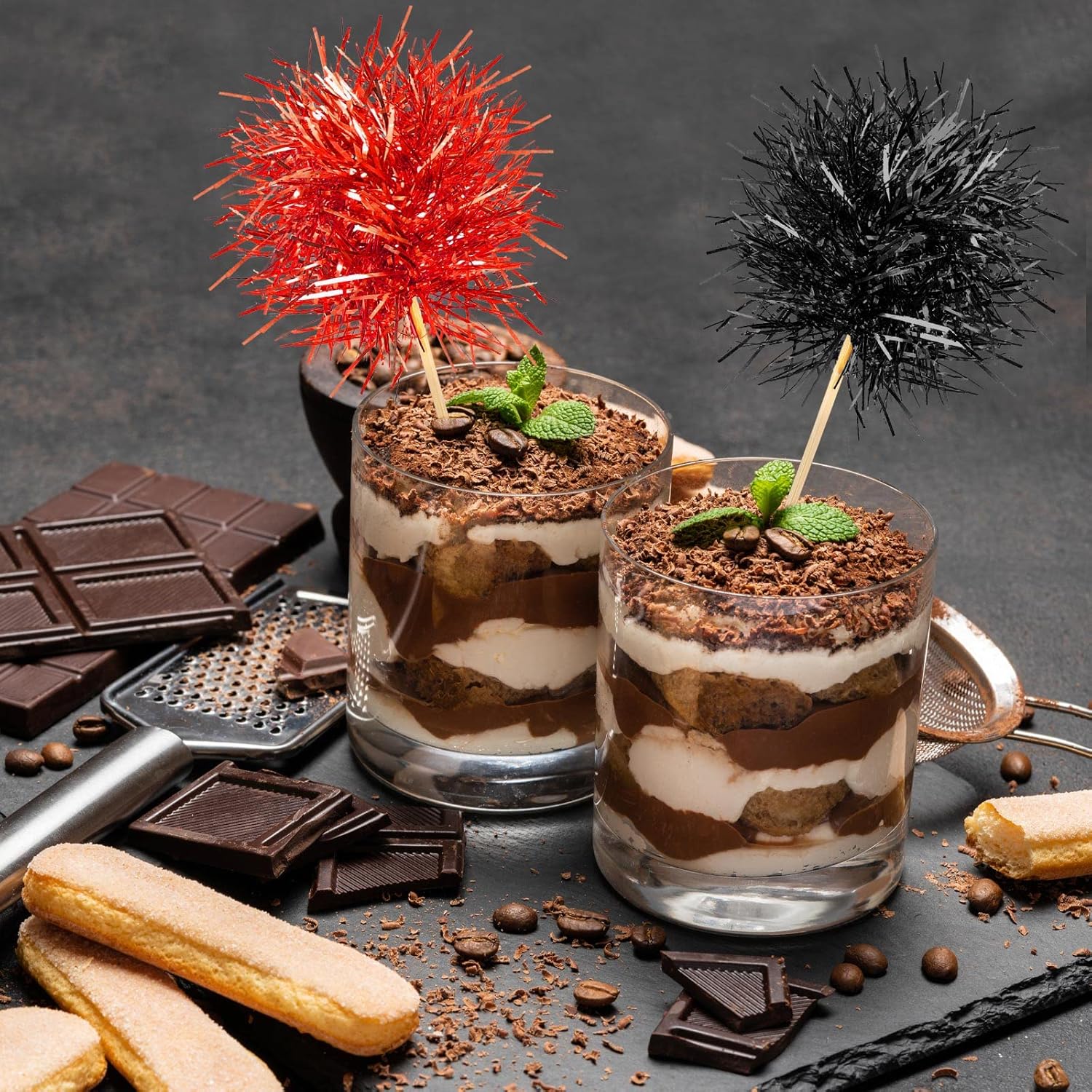 Chinco 100 Pcs Foil Firework Cupcake Toppers Sparkle Tinsel Cake Toppers Cake Decoration Cocktail Fruit Toothpick for Birthday Wedding Graduation Party(Red, Black)