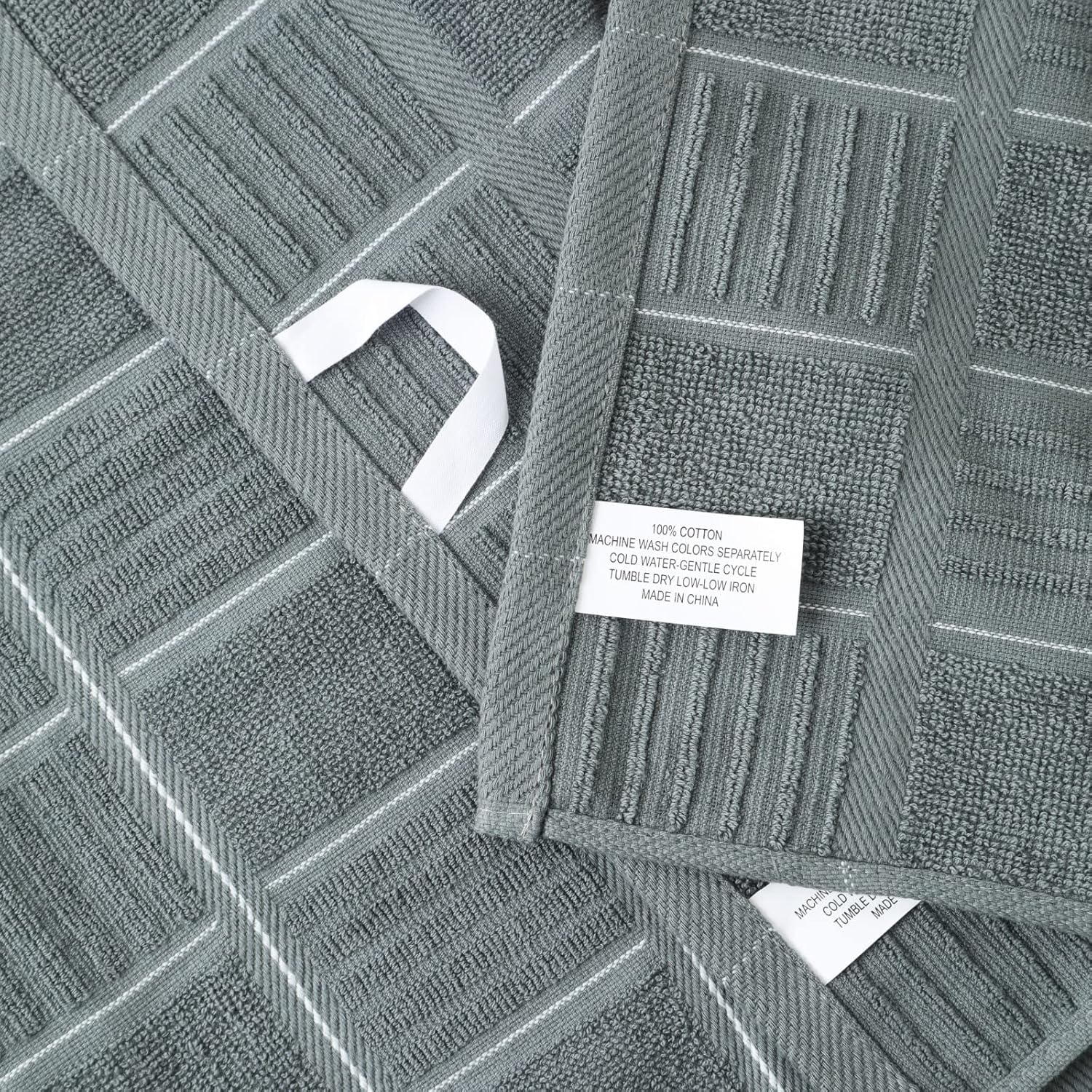 - With hanging loop for easy storage. On the kitchen towels set there is a hanging loop on the middle, you can easily put it on the hook and other places that is convenient for you