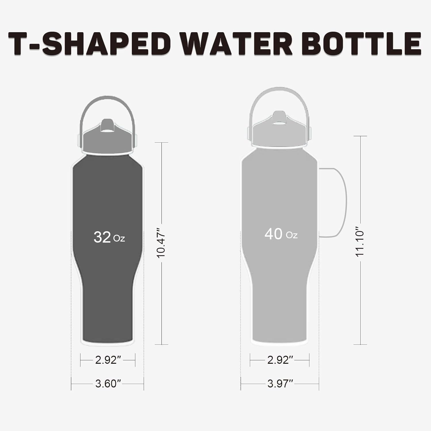 - 【T-SHAPED FOR CUP HOLDER】 Designed with a sleek and slim outline, this T-shaped 32 oz water bottles fits in cup holder. ABOTOCUP T-shaped water bottle stainless steel suitable for outdoor when driving, cycling, beach holidays, and camping. Water bottle 32oz large capacity keeps your adventures running longer.