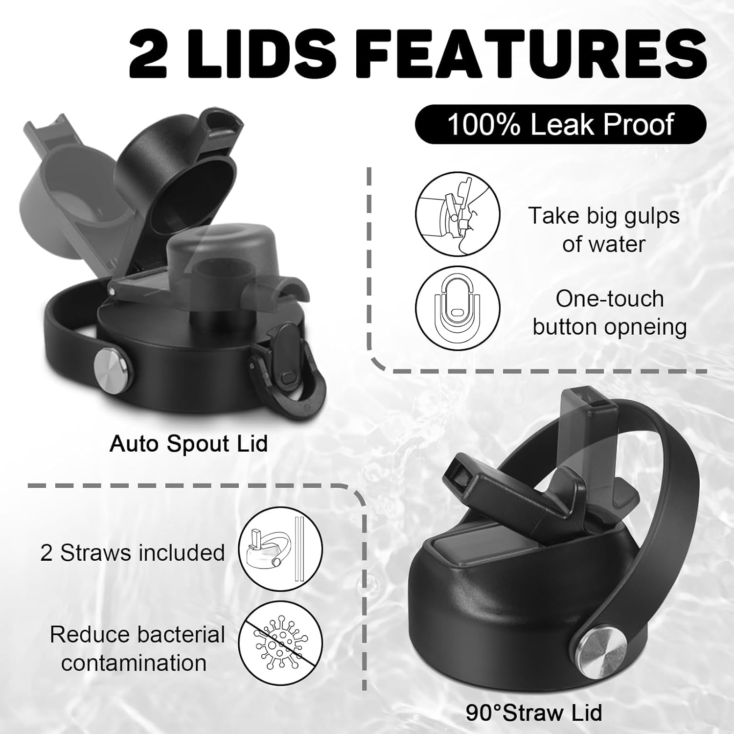 - 【2 LEAK-PROOF LIDS】ABOTOCUP 32 oz insulated water bottle provide a different drinking experience with two lids that are fully leak-proof and designed for effortless drinking. Water bottle stainless steel easy to use one-handed or hands-free drinking even when you're busy. Water bottle stainless steel perfect for all indoor and outdoor activities.