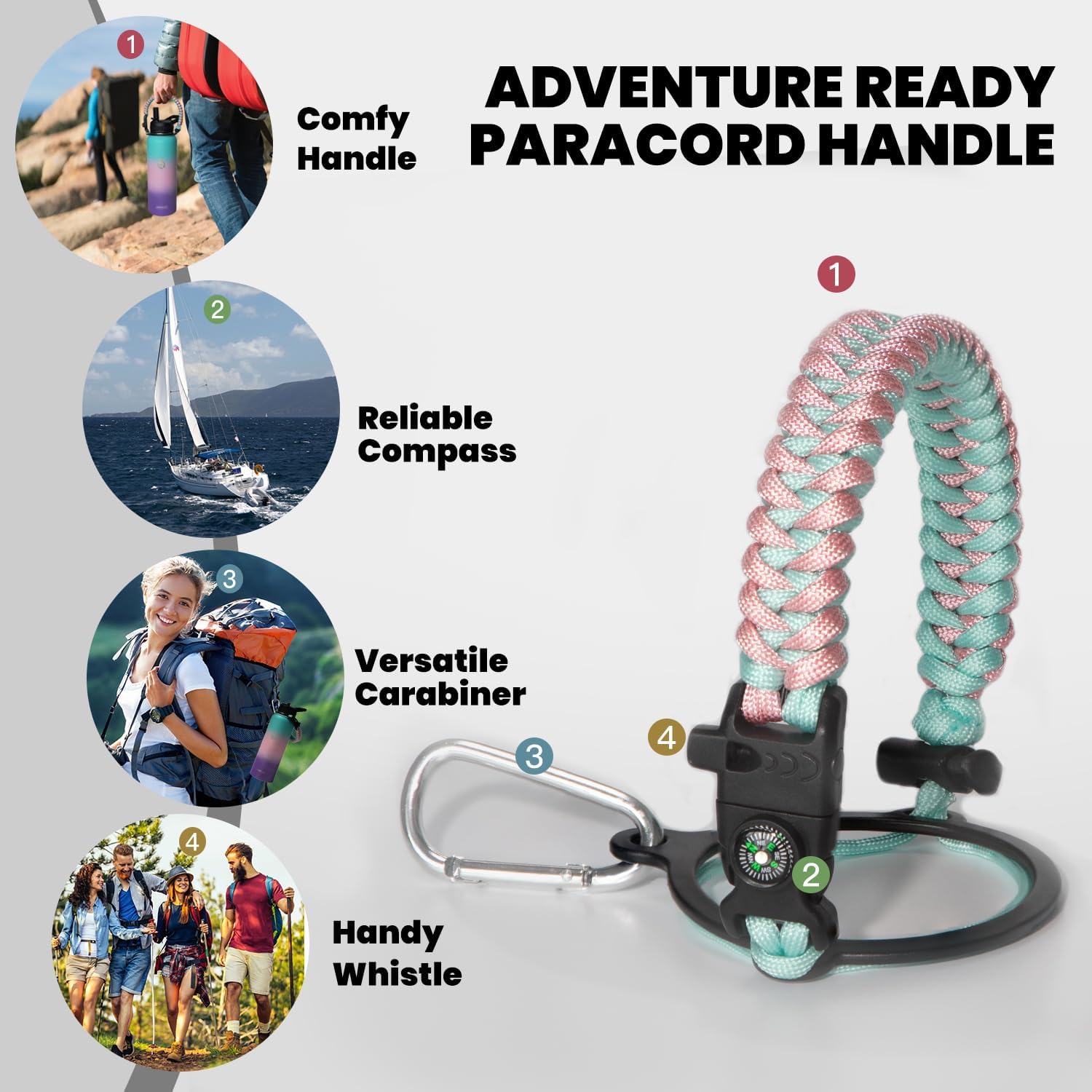 - Iconic Paracord Handle: This insulated water bottle comes with a beautiful hand knit nylon paracord in coordinated color with the water bottle. Configured with a compass and carabiner, this paracord handle is a must-have as a full functional camping / hiking flask