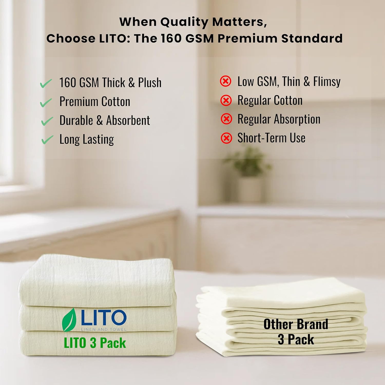 - ✅ Premium 160 GSM Thick Flour Sack Towels – Kitchen-Grade Absorbency Say goodbye to flimsy towels! LITO's ultra-dense 160 GSM 100% ring-spun cotton fabric with a thread count of 130, flour sack towels deliver superior thickness and plush softness—perfect for kitchen drying, wiping, and heavy-duty use.
