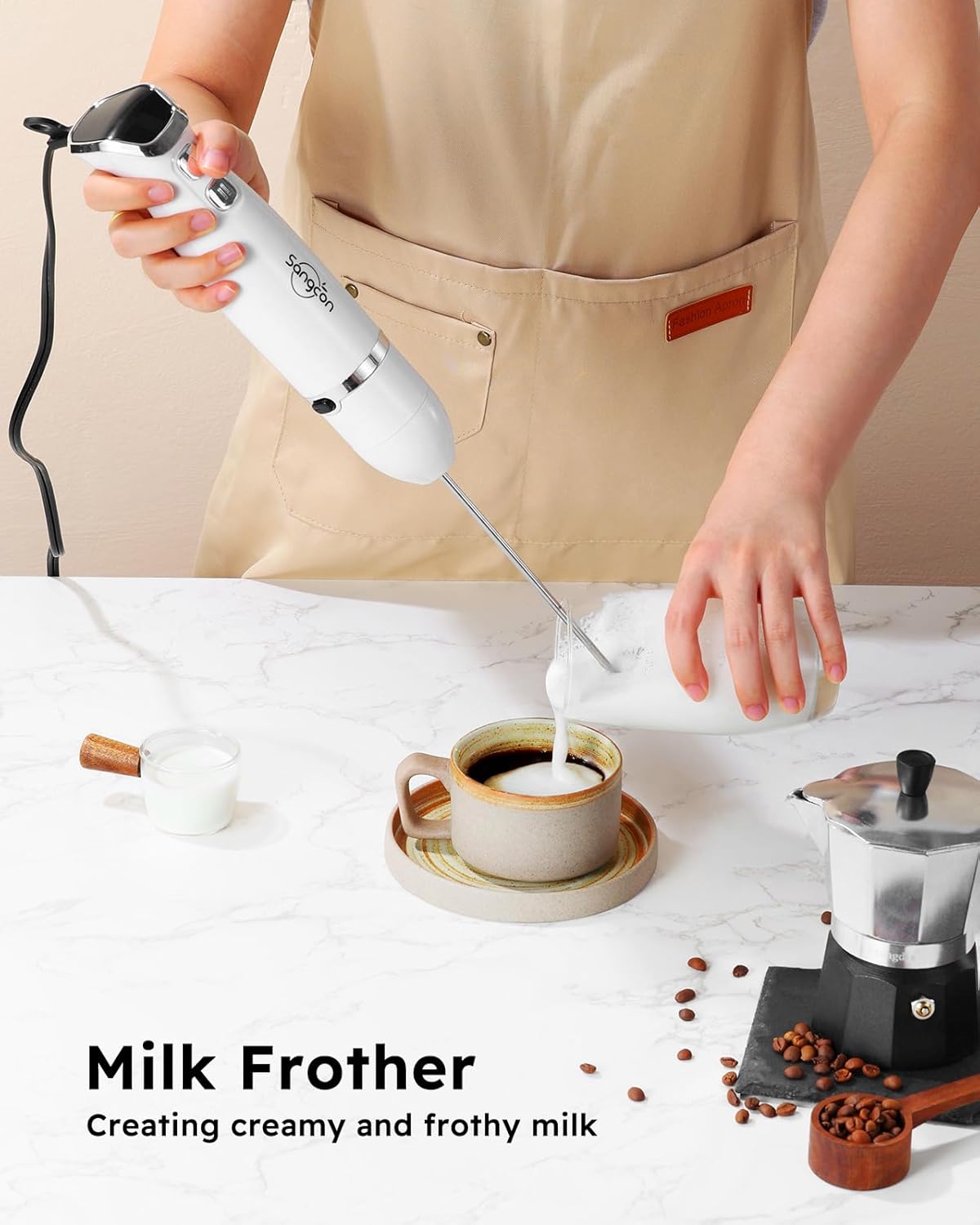 - 【The Stylish Gift for Home Chefs】 Whether you're treating yourself or surprising a home chef in your life, Sangcon hand held blender stick is the thoughtful gift. It empowers anyone to transform recipes into reality, effortlessly blending ingredients for everything from smoothies to soups and sauces, right in a pot, cup, or bowl. For Easter, Mother's Day, Father's Day, birthdays, or any celebration, the Sangcon hand blenders for kitchen is guaranteed to be a stylish gift!