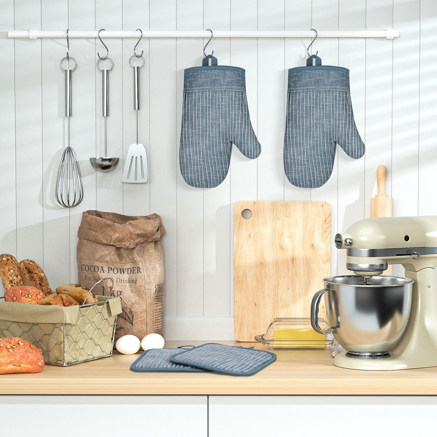 - PRACTICAL HANGING LOOP: The oven mitts in a size of approx. 11 x 7.1 inches and pot holders in a size of approx. 6.7 x 6.7 inches are provided with practical hanging loops, which are used for easy storage, so that they are always at hand when you need them and take up next to no space.