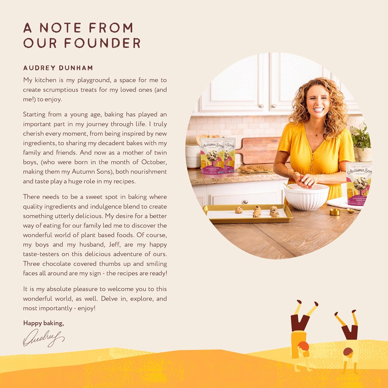 - From the Creator, Audrey Dunham: Baking has always been a passion of mine, and my kitchen is where I love to create delicious treats for my loved ones. As a mother of young twin boys (born in October, making them my Autumn Sons), nourishment and taste play a huge role in my recipes. There must be a sweet spot in baking where premium ingredients and indulgence blend to create something utterly delicious. Welcome to this wonderful world! Delve in, explore, and enjoy!