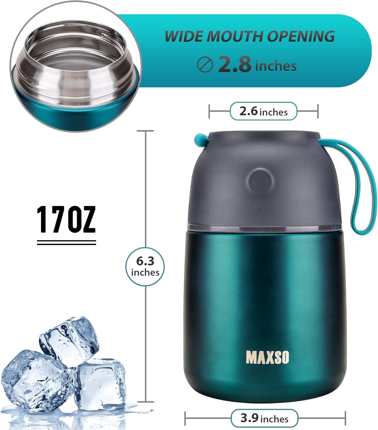 Insulated Thermo Food Jar for Hot & Cold Food for Kids Adult, 17 oz Soup Thermal Hot Food Containers for Lunch, Triple Layer Insulation Stainless Steel Food Jar with Spoon (Green)