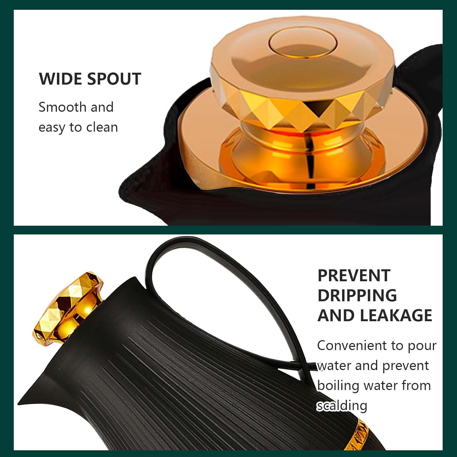 - 【Premium Materials】This carafe for hot water comes with a premium quality, ABS plastic outer body that does not sweat, is rust proof and gives the vacuum carafe lasting durability. It features a leak proof lid that prevents any drips and locks in freshness of your drinks.