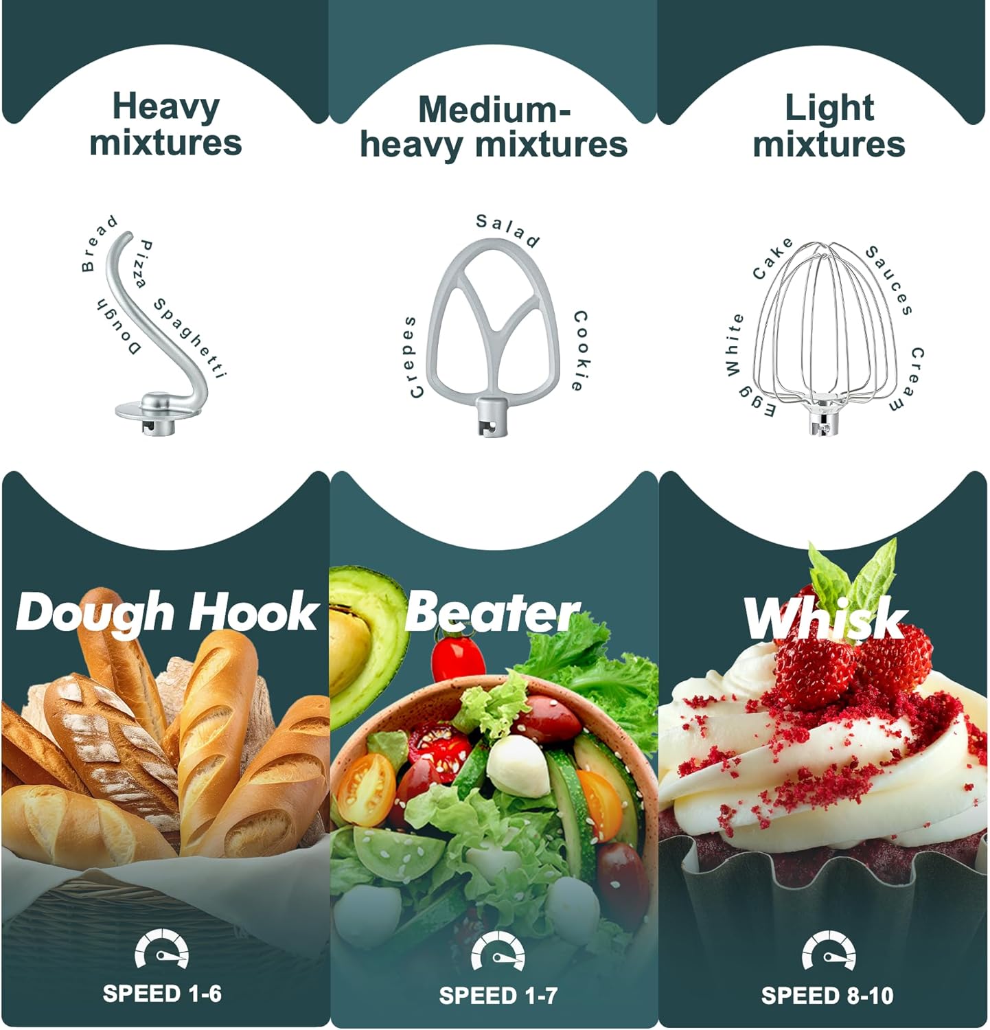 - 10 Speeds and Tilt Head Design - This Kitchen mixer has 10 different speed options,suitable for mixing bread dough, thick batters, meringues, and whipping cake cream, plus lower speeds for stirring and finessing your most delicate concoctions,could suit perfectly to different ingredients. Tilt-head design mixer allows access to install or uninstall bowls and accessories easily.