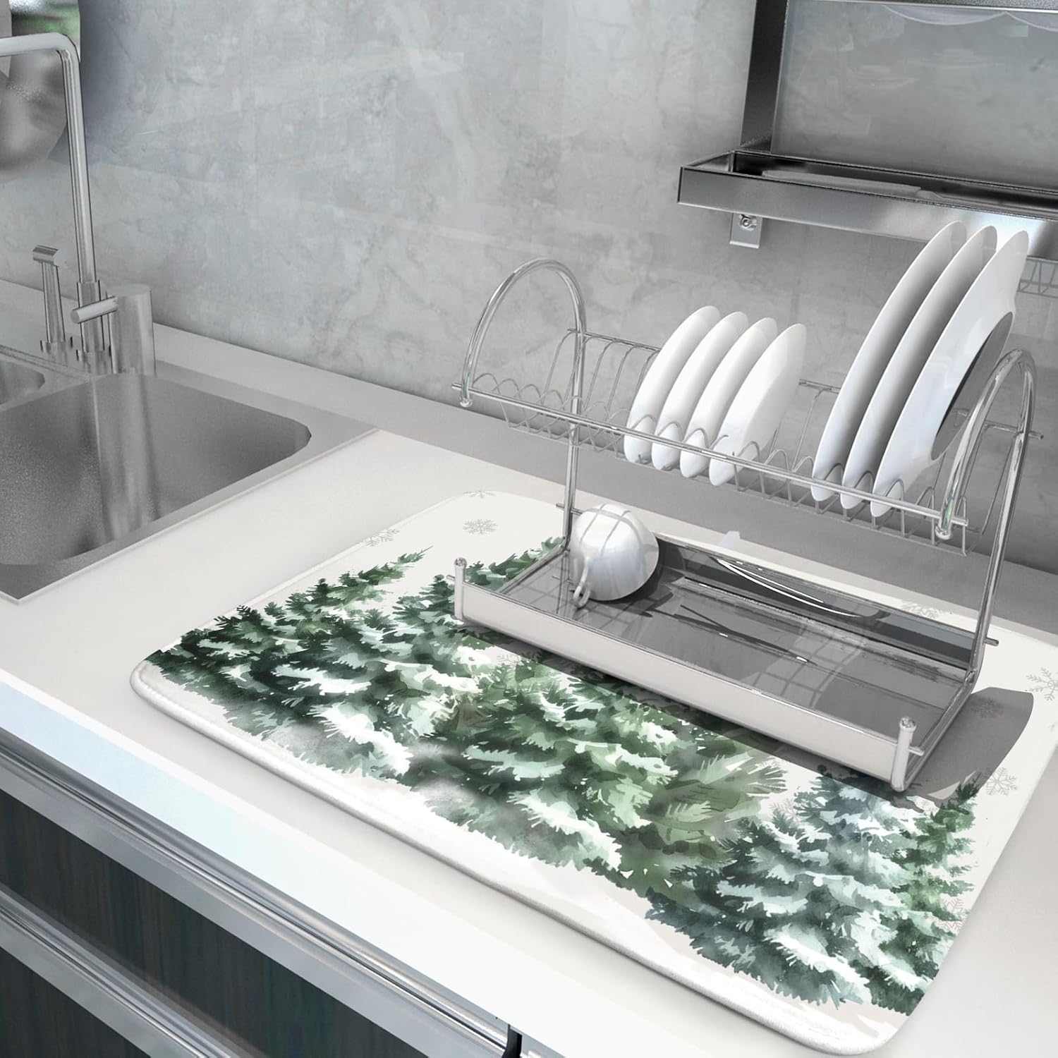 Christmas Dish Drying Mat 16x18 Inch Xmas Forest Tree Absorbent Dish Drainer Protector Pad Winter Holiday Microfiber Drying Mats Absorbent Reversible Dish Pad Kitchen Accessories for Countertop