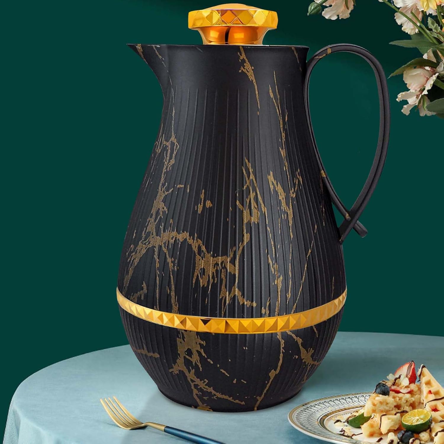 Insulated Thermal Coffee Carafe, 33 oz, Luxury Arabic-Style Insulated Carafe Flask, Coffee Tea Pot, with Spout and Glass Liner for Hot Cold Water, Housewarming Ornaments (Black and Gold)