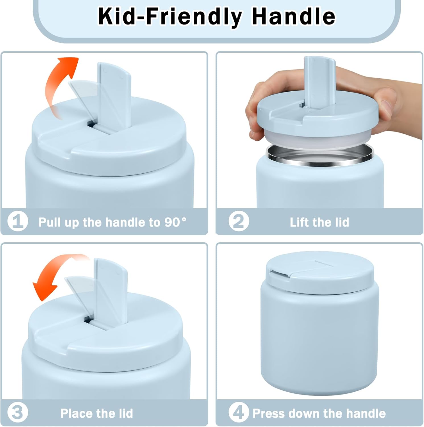 - Easy to Open: This thermos for hot food features a unique Buckle Structure design. Simply pull the handle to a 90° angle to easily open the lid. The handle is especially child-friendly, allowing little hands to open it with ease.