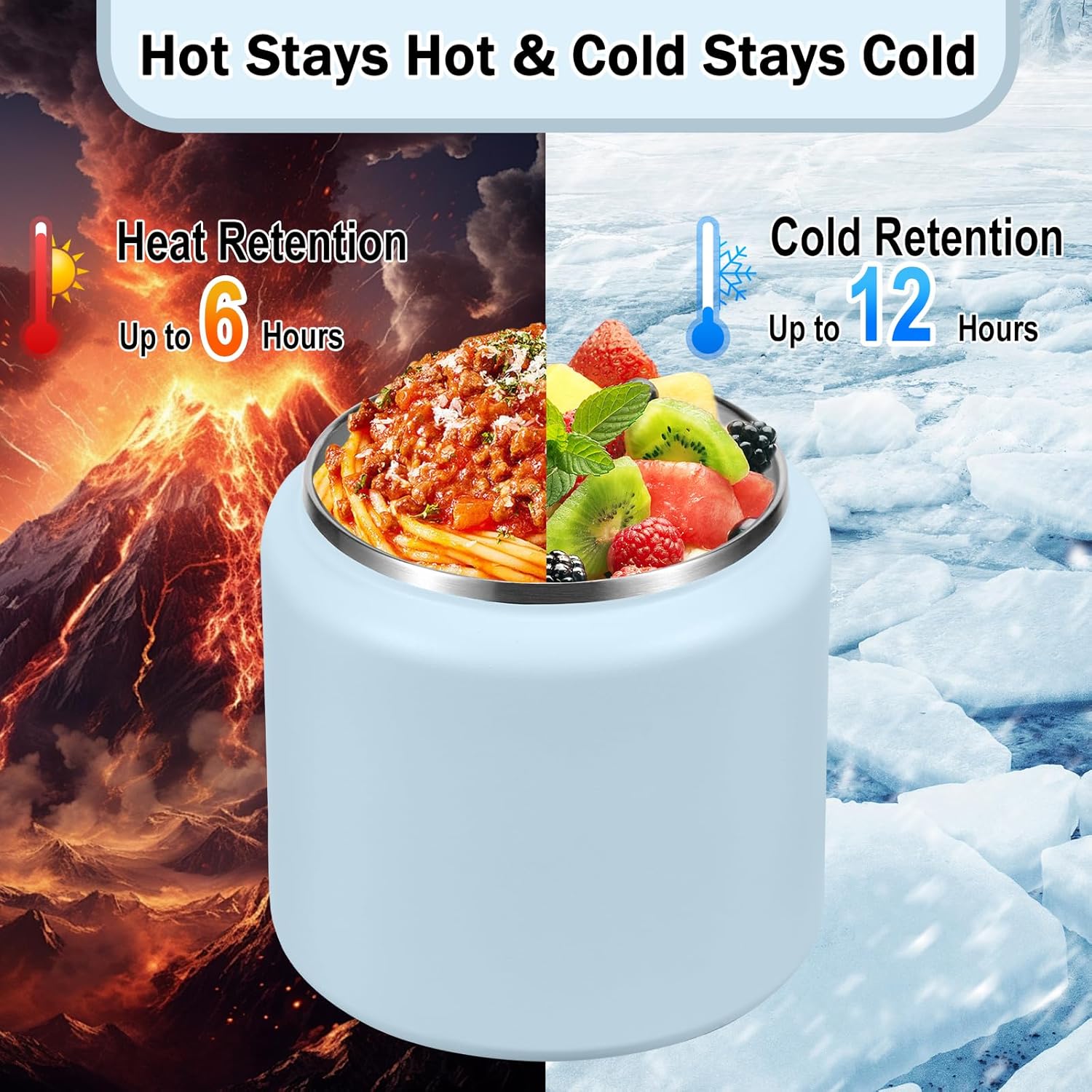 - Thermos for Hot Food: Made with 18/8 stainless steel and featuring a vacuum-sealed design, this food thermos keeps food hot for up to 6 hours and cold for up to 12 hours. It's completely reusable and made from eco-friendly, BPA-free, food-safe materials.