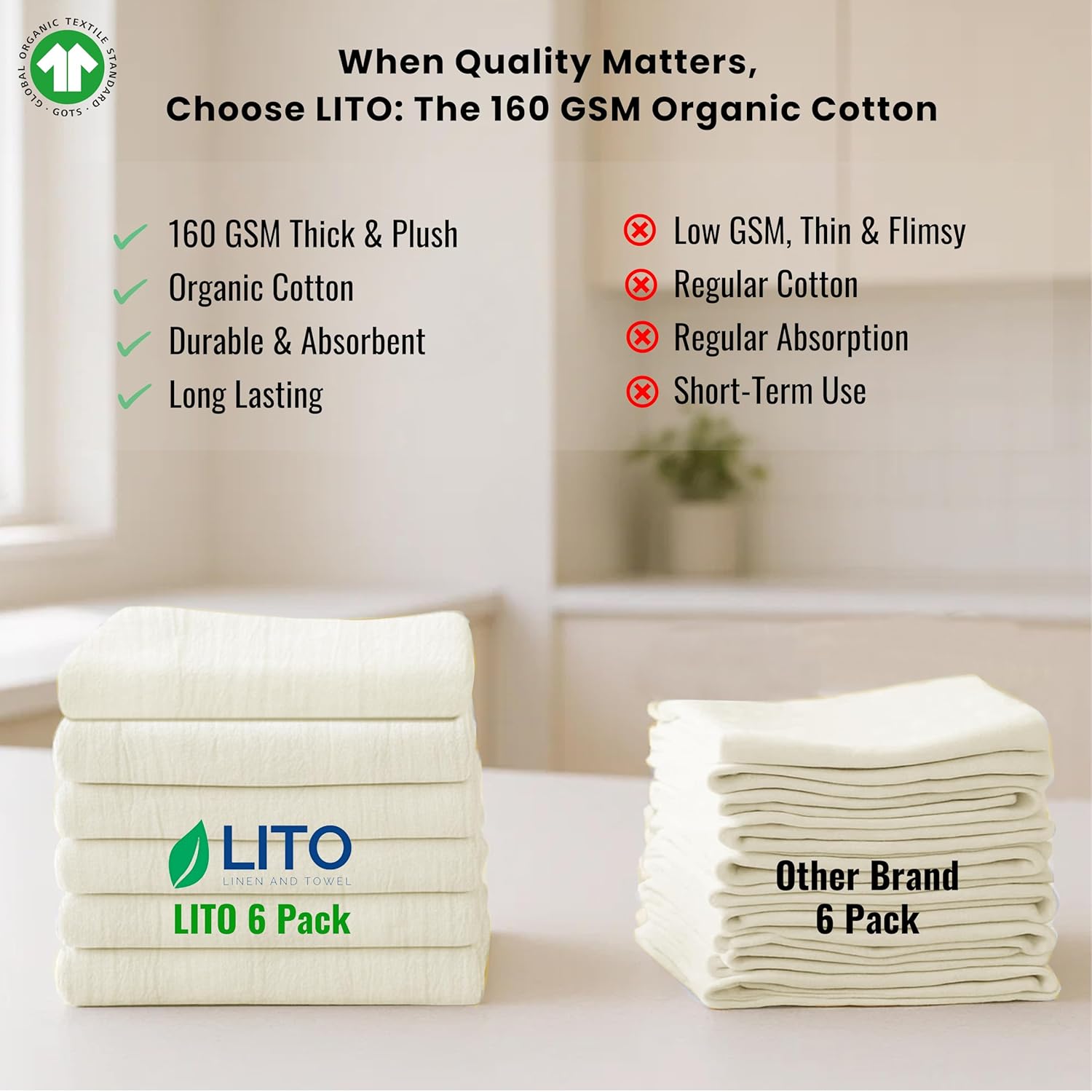 - ✅ Premium 160 GSM Thick Flour Sack Towels – Kitchen-Grade Absorbency Say goodbye to flimsy towels! LITO's ultra-dense 160 GSM 100% ring-spun cotton fabric with a thread count of 130, flour sack towels deliver superior thickness and plush softness—perfect for kitchen drying, wiping, and heavy-duty use.