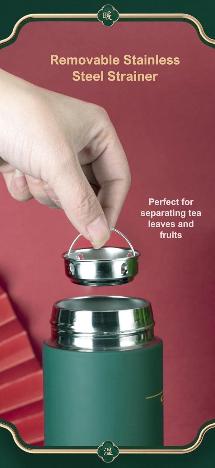 Insulated Coffee Tea Travel Thermos Mug Water Bottle with Removable Strainer and Temperature Featuring Elegant Asian Art Design - 16.9 fl oz (Teal)