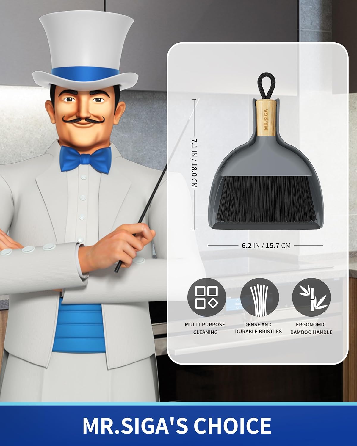 - MR.SIGA mini handheld dustpan and brush set has a natural bamboo handle, which is more environmentally friendly and comfortable to hold. Measures 7.1 " x 6.2 "