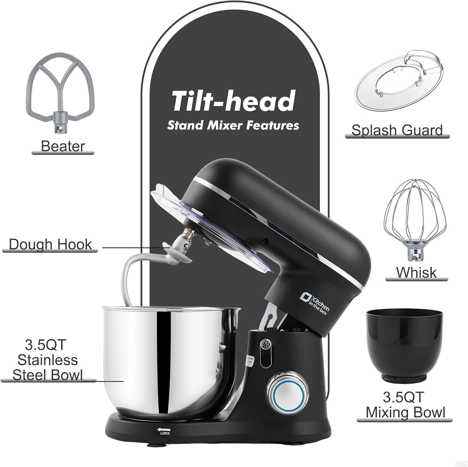 Kitchen in the Box Stand Mixer, 3.5QT Two Bowls Small Kitchen Electric Mixer, 10-Speed Portable Lightweight Matte Finish with Egg Whisk, Dough Hook, Beater (Onyx Black, 3.5QT)