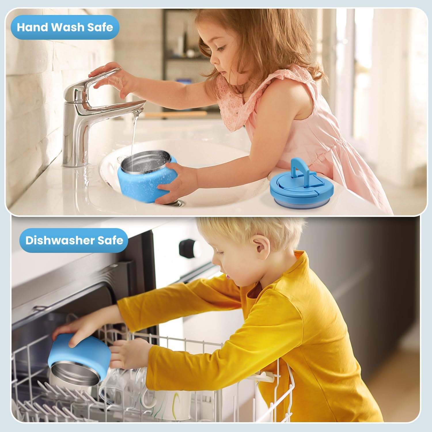 - New Buckle of Lid: The food containers feature a press-seal construction, allowing you to simply pull the handle upwards to 90° to open the lid/ 90° downward closure. This design is maintaining vacuum no need to rotate the lid open . Additionally, the container comes equipped with a carrying handle, making it convenient for your child to carry it. Whether at school, an outdoor outing, or a family gathering, this user-friendly design empowers children to confidently enjoy their delicious meals.