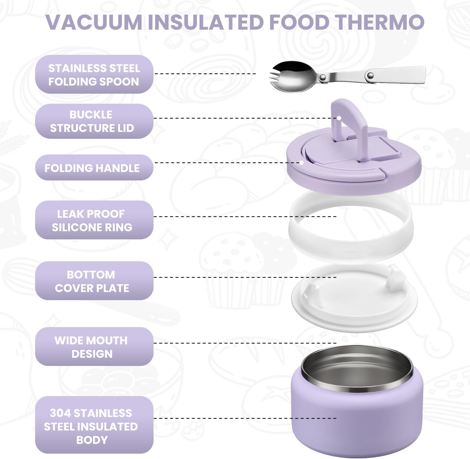 - Leak Proof Design: The compression vacuum design with seal washer guarantees 100% leak-proof, the hidden handle and hidden folding spoon are designed for easy opening and carrying. Don't worry about it spilling out and messing up kids lunch bag.