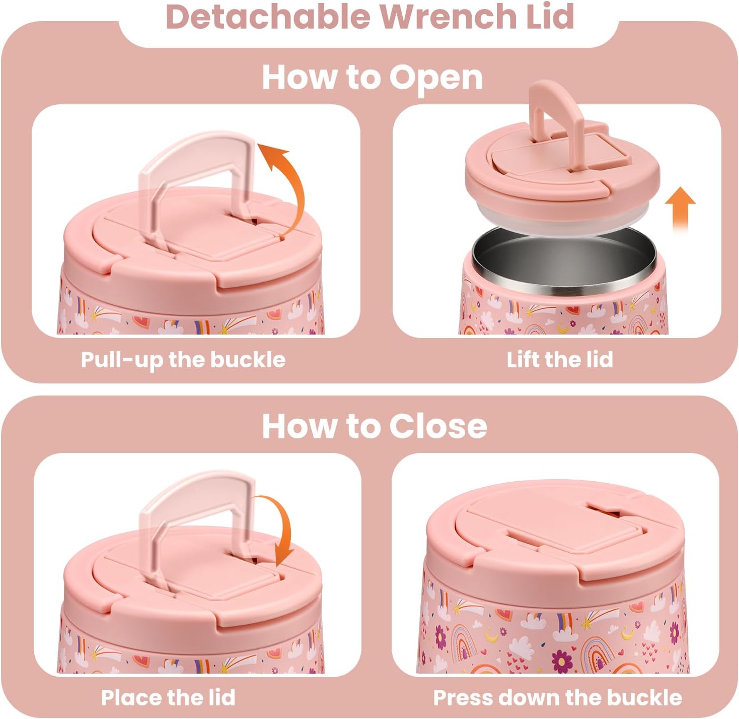 - New Buckle of Lid: The food containers feature a press-seal construction, allowing you to simply pull the handle upwards to 90° to open the lid/ 90° downward closure. This design is maintaining vacuum no need to rotate the lid open . Additionally, the container comes equipped with a carrying handle, making it convenient for your child to carry it. Whether at school, an outdoor outing, or a family gathering, this user-friendly design empowers children to confidently enjoy their delicious meals.