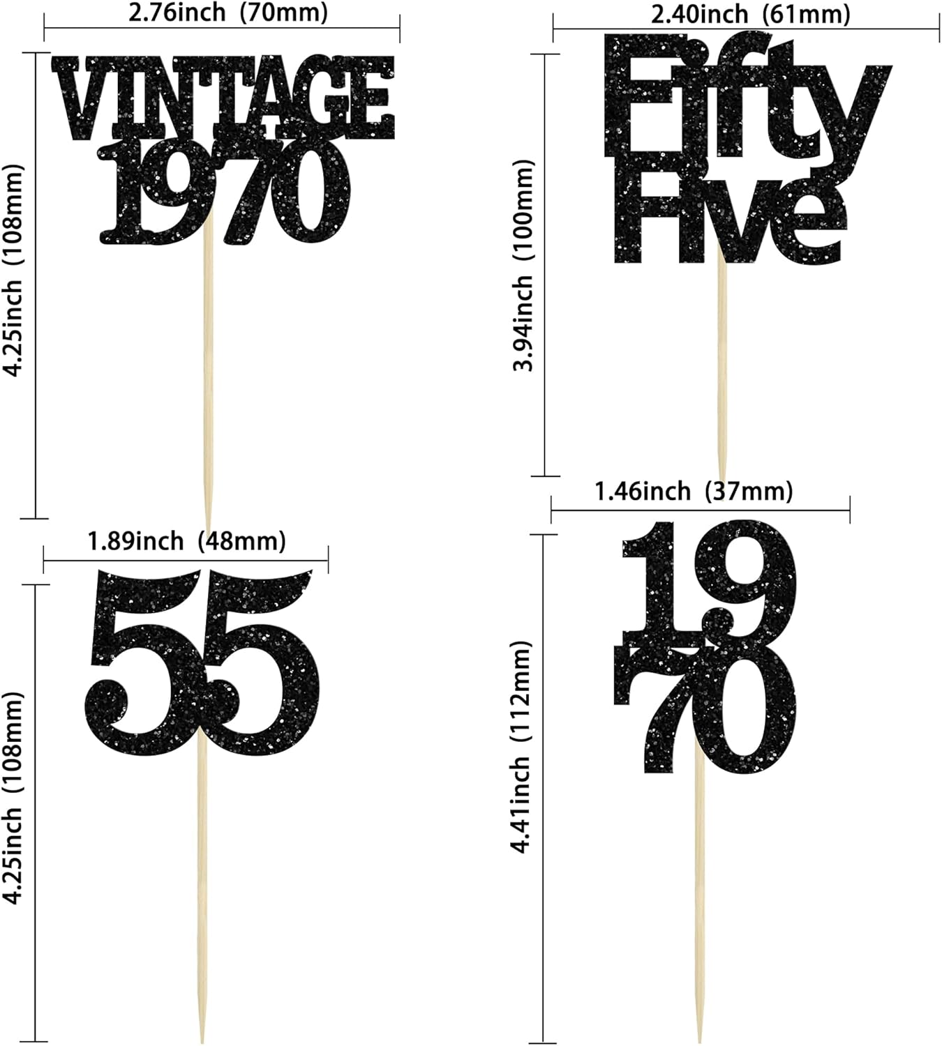 Gyufise 24Pcs Vintage 1970 Cupcake Toppers Glitter Cheers to 55 Fabulous Fifty Five Cupcake Picks 55th Birthday Wedding Anniversary Party Cake Decorations Supplies Black