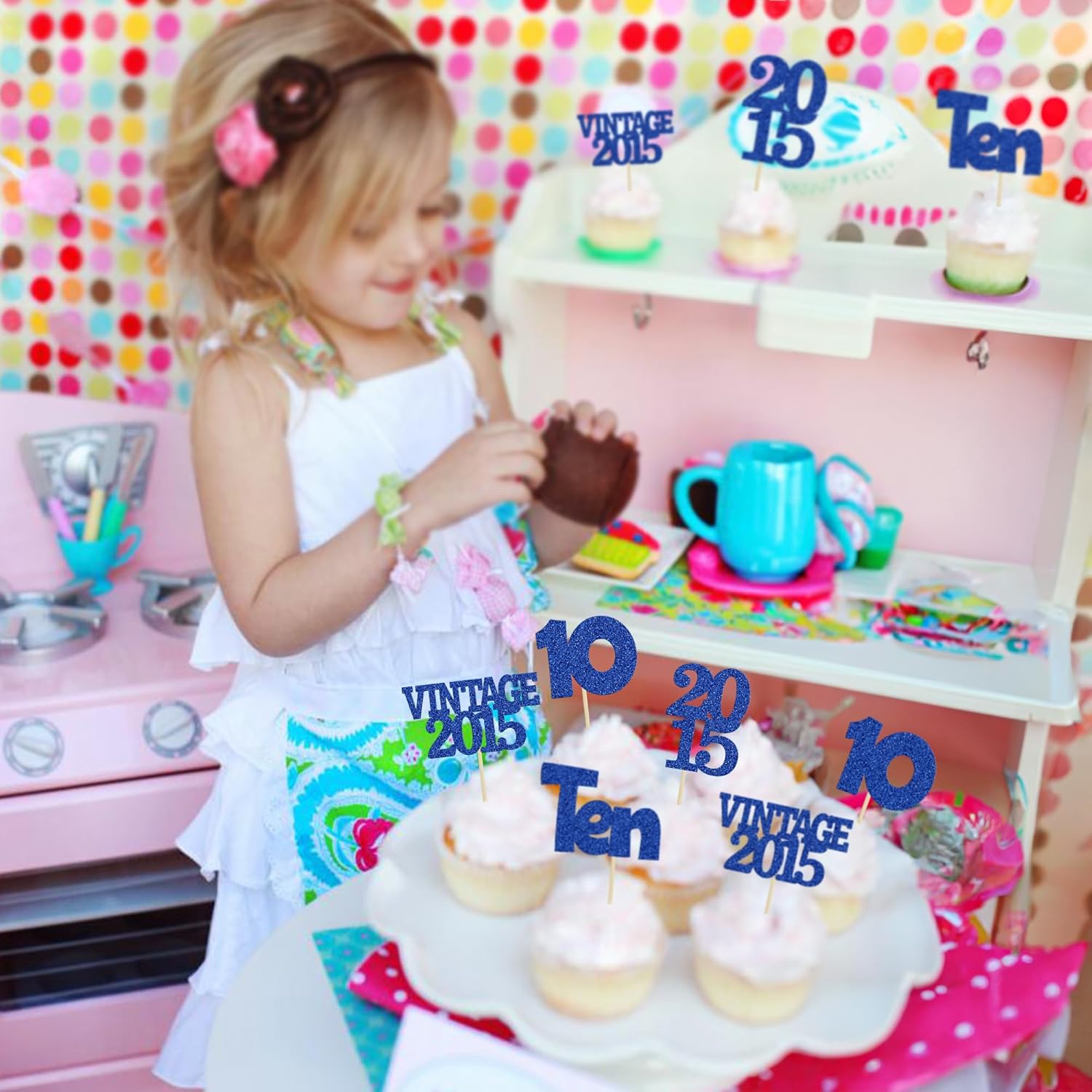 Gyufise 24Pcs 10th Birthday Cupcake Toppers Glitter Ten Vintage 2015 Double Digits 10 Cupcake Picks Birthday Cake Decorations for Happy 10th Birthday Anniversary Party Supplies Deep Blue