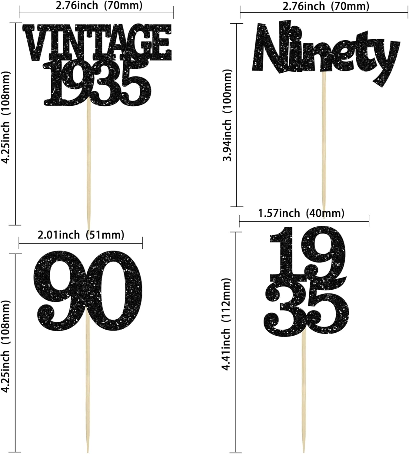 Gyufise 24Pcs Vintage 1935 Cupcake Toppers Glitter Cheers to 90 Fabulous Ninety Cupcake Picks 90th Birthday Wedding Anniversary Party Cake Decorations Supplies Black