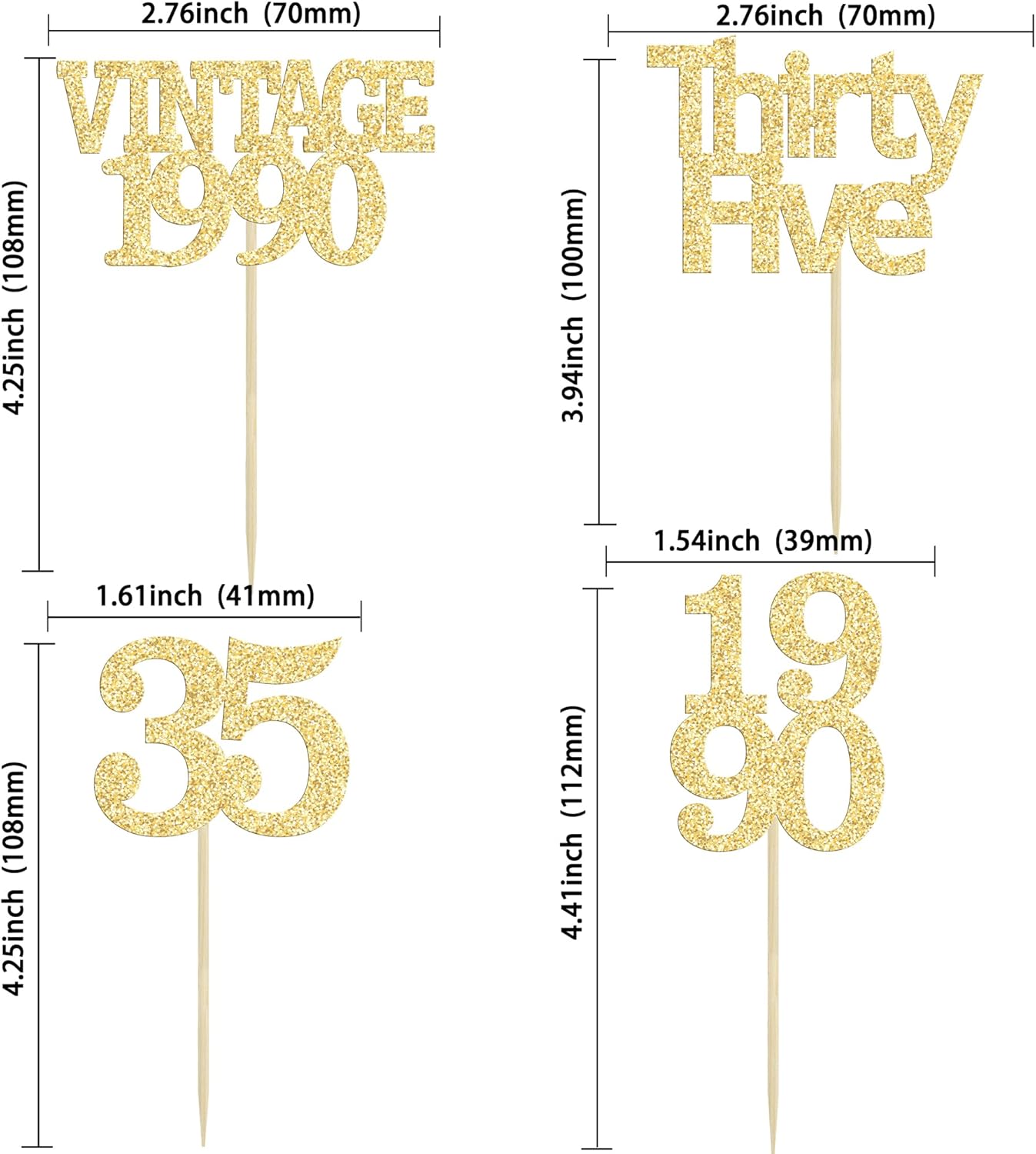Gyufise 24Pcs Happy 35th Birthday Cupcake Toppers Glitter Thirty Five 35 Fabulous Vintage 1990 Cupcake Picks for 30th Birthday Wedding Anniversary Party Cake Decorations Supplies Gold