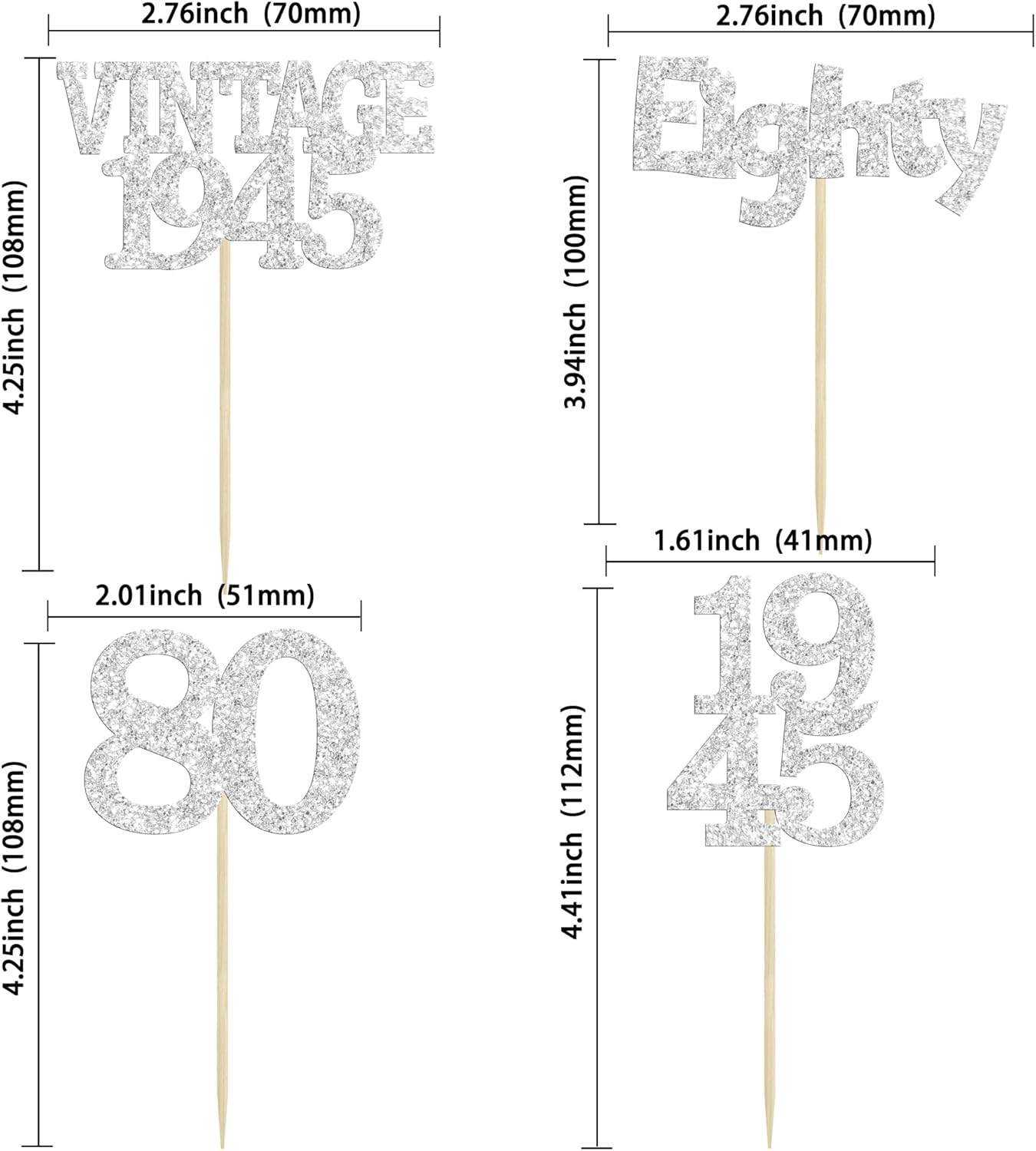 Gyufise 24Pcs 80th Birthday Cupcake Toppers Glitter Cheers to 80 Fabulous Eighty Vintage 1945 Cupcake Picks 80th Birthday Wedding Anniversary Party Cake Decorations Supplies Silver
