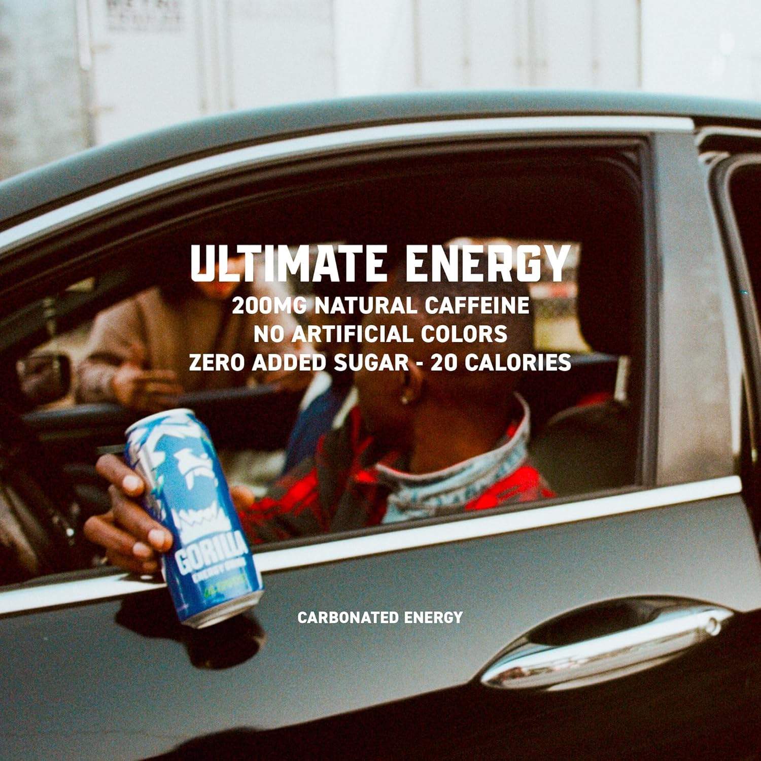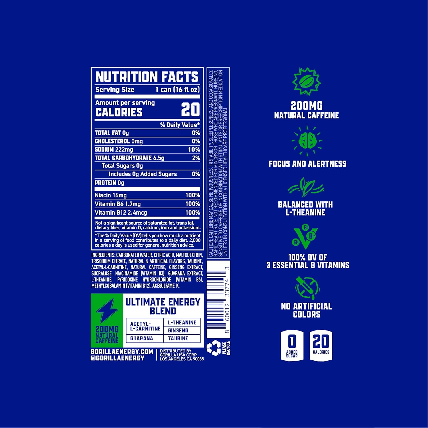 Gorilla Energy Original Energy Drink, Zero Sugar & 200mg Natural Caffeine, L-Theanine, Taurine, Ginseng, Acetyl L-Carnitine, B Vitamins, Sugar Free, and No Artificial Colors, 16 oz Cans, 12 Pack