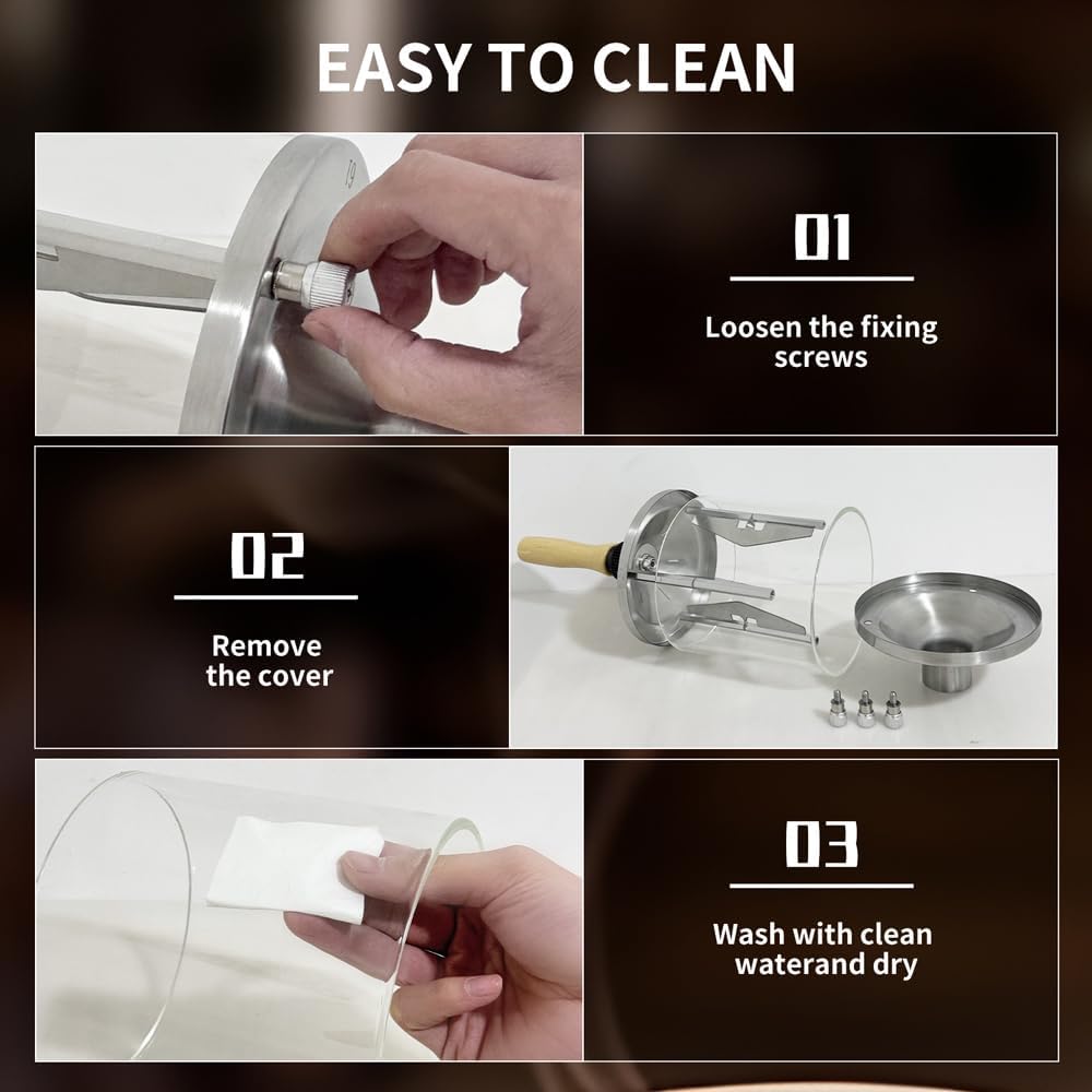 - Daily cleaning is also an important step, cleaning the coffee bean bin is convenient and quick, no need to use any tool, only need to rotate the three spring screws on the front of the drum by hand to remove the quartz glass for cleaning
