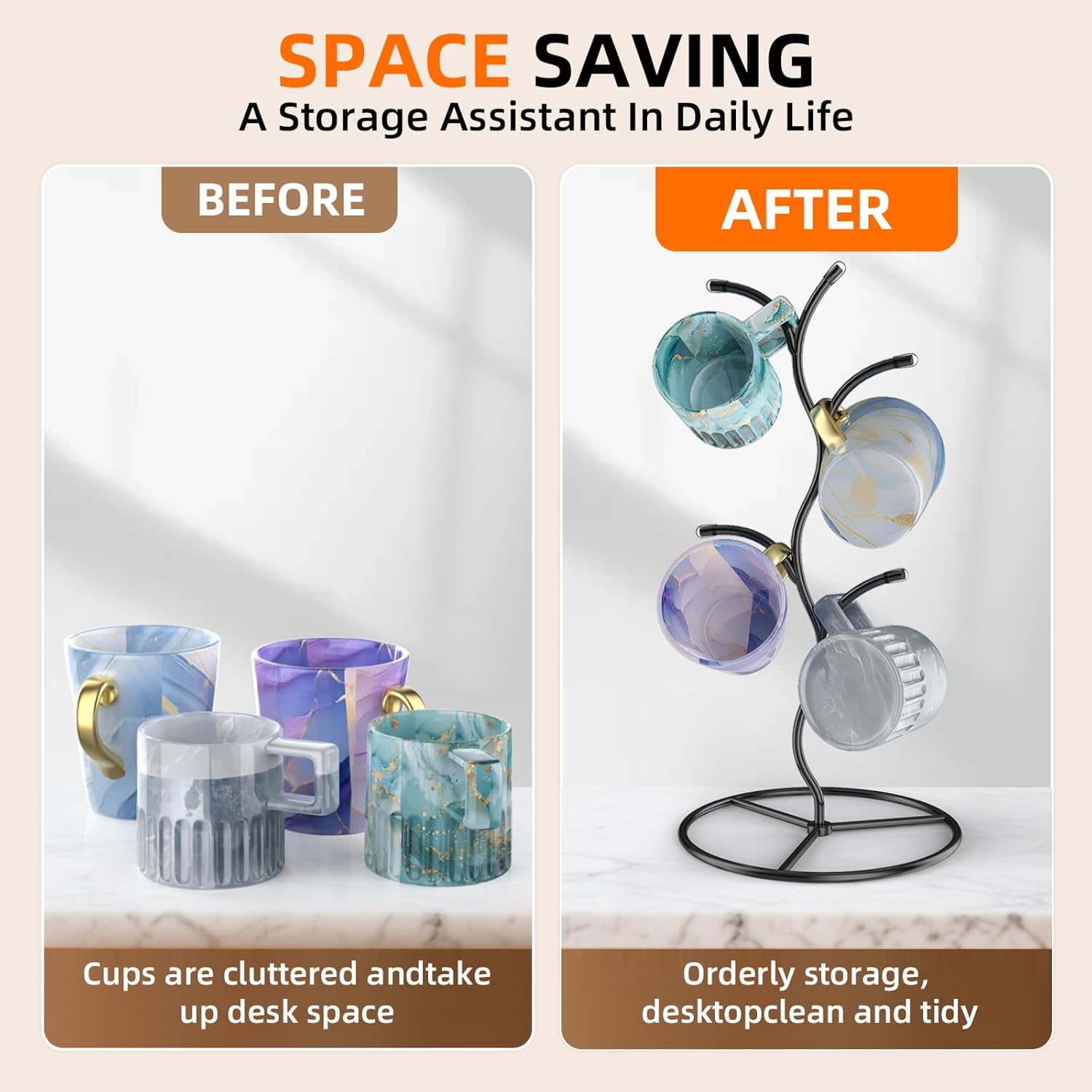 - 【Easy Tool-Free Assembly Mug Tree】Sets up in seconds! Just twist the branches into place—no tools needed. Beesini countertop mug holder maximizes space to neatly store all your cups and mugs.