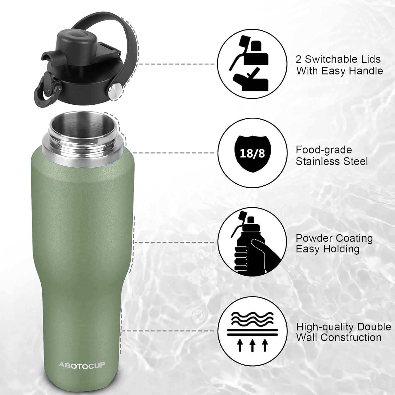 - 【2 LEAK-PROOF LIDS】ABOTOCUP 32 oz insulated water bottle provide a different drinking experience with two lids that are fully leak-proof and designed for effortless drinking. Water bottle stainless steel easy to use one-handed or hands-free drinking even when you're busy. Gym water bottle stainless steel perfect for all indoor and outdoor activities.