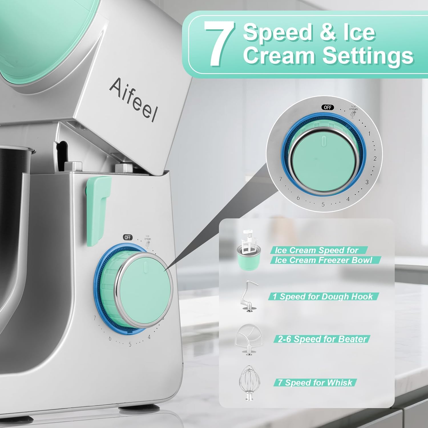 Aifeel Stand Mixer,6.5QT Kitchen Electric Mixer with 2QT Ice Cream Maker Bowl, 6 in 1 Multifunctional Bread Dough Mixer with Dough Hook,Whisk & Beater, Food Mixer for Baking (Green-Silver)